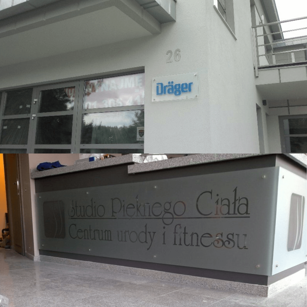 - Szyldy z piaskowanym wzorem – eleganckie napisy i logotypy o satynowym wykończeniu.